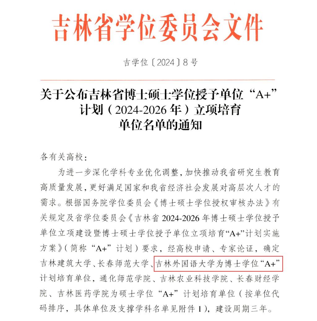 近日,吉林省学位委员会下发《关于公布吉林省博士硕士学位授予单位“A+”计划(2024—2026年)立项培育单位名单的通知》(吉学位〔2024〕8号),学校正式获批2024—2026年博士学位“A+”计划立项培育单位,翻译、教育、国际中文教育获批立项培育专业学位类别。